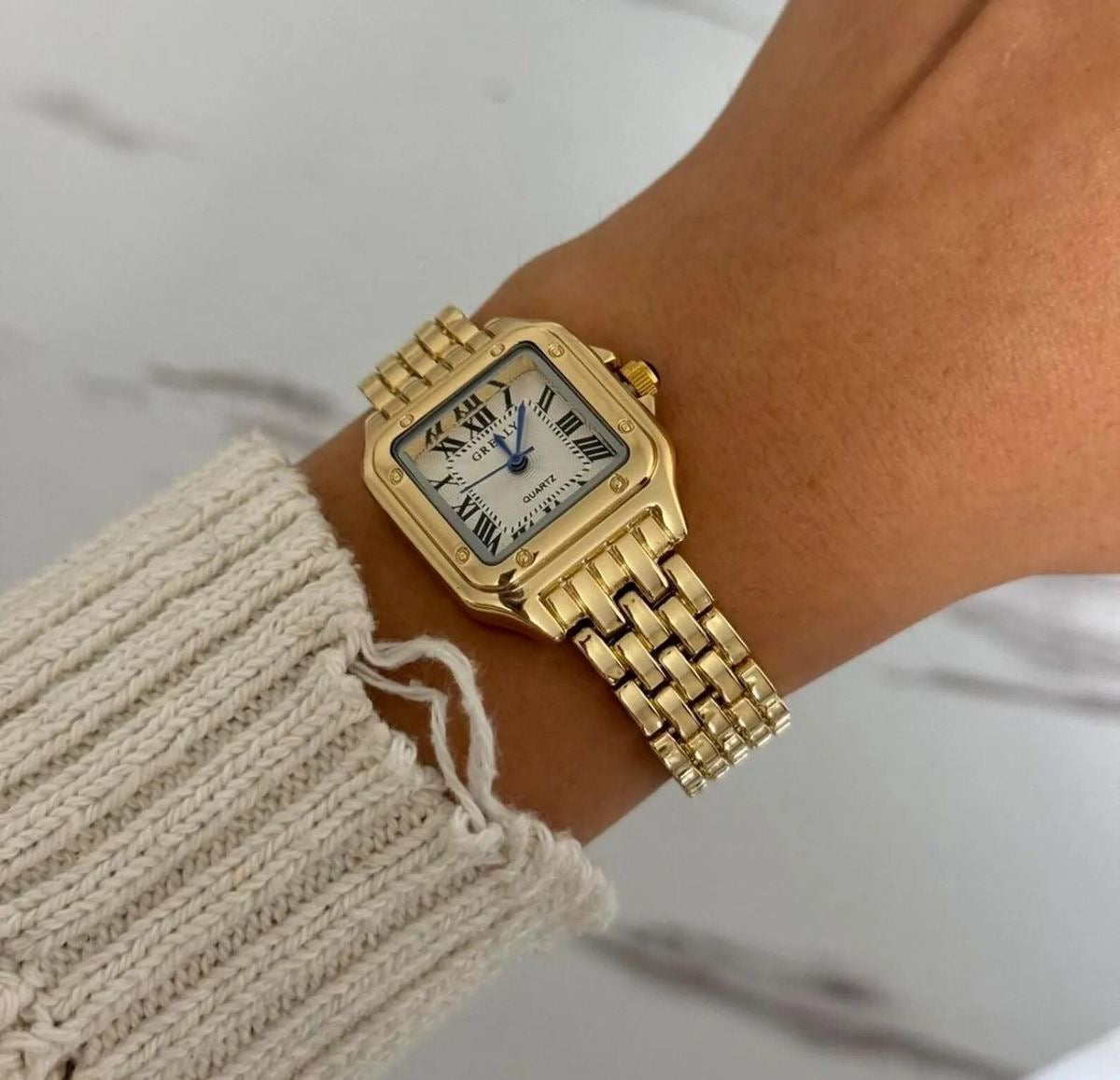 Elegant, refined, and timeless, this gold watch brings light and sophistication to every wrist. Crafted from a premium alloy with a polished finish, it offers lasting shine and everyday durability. Its square dial with Roman numerals and sapphire-blue hands reflects the charm of classic watchmaking, while remaining perfectly modern. A statement timepiece designed for both day and evening wear.